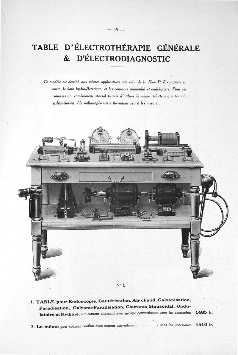 Tableaux pour endoscopie, cautérisation, air chaud, galvanisation, faradisation, courant sinusoïdal, courants permanents et rythmés