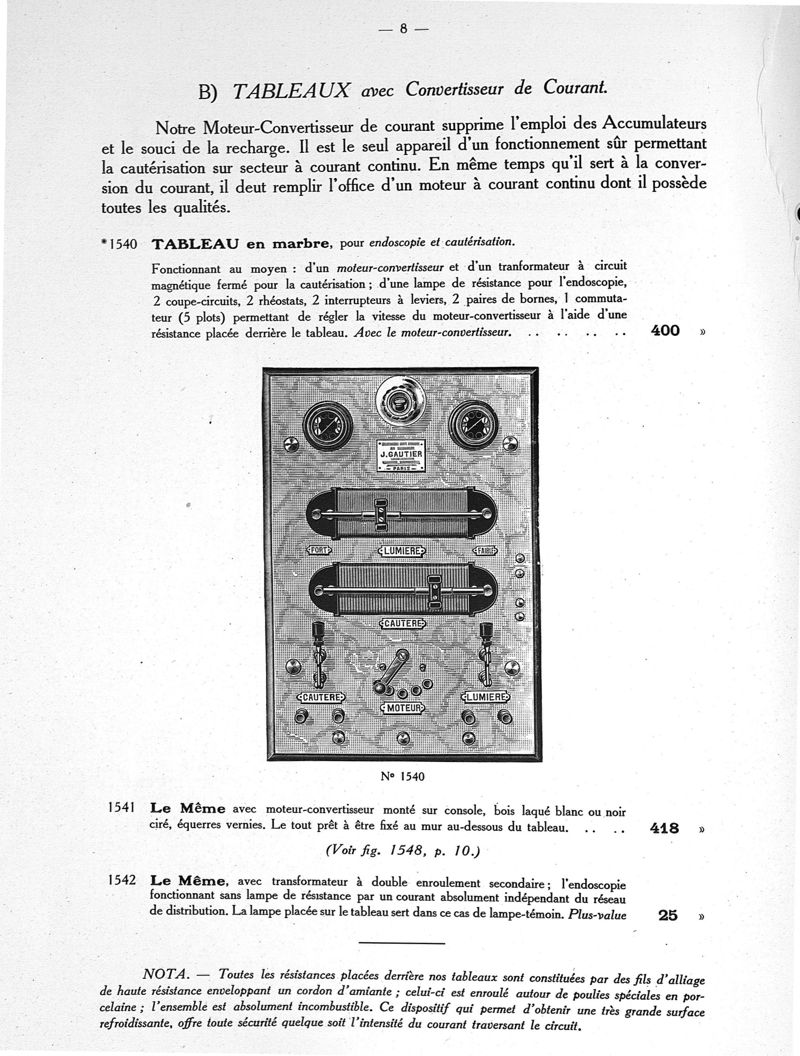 Tableaux pour endoscopie, cautérisation, air chaud, galvanisation, faradisation, courant sinusoïdal, courants permanents et rythmés