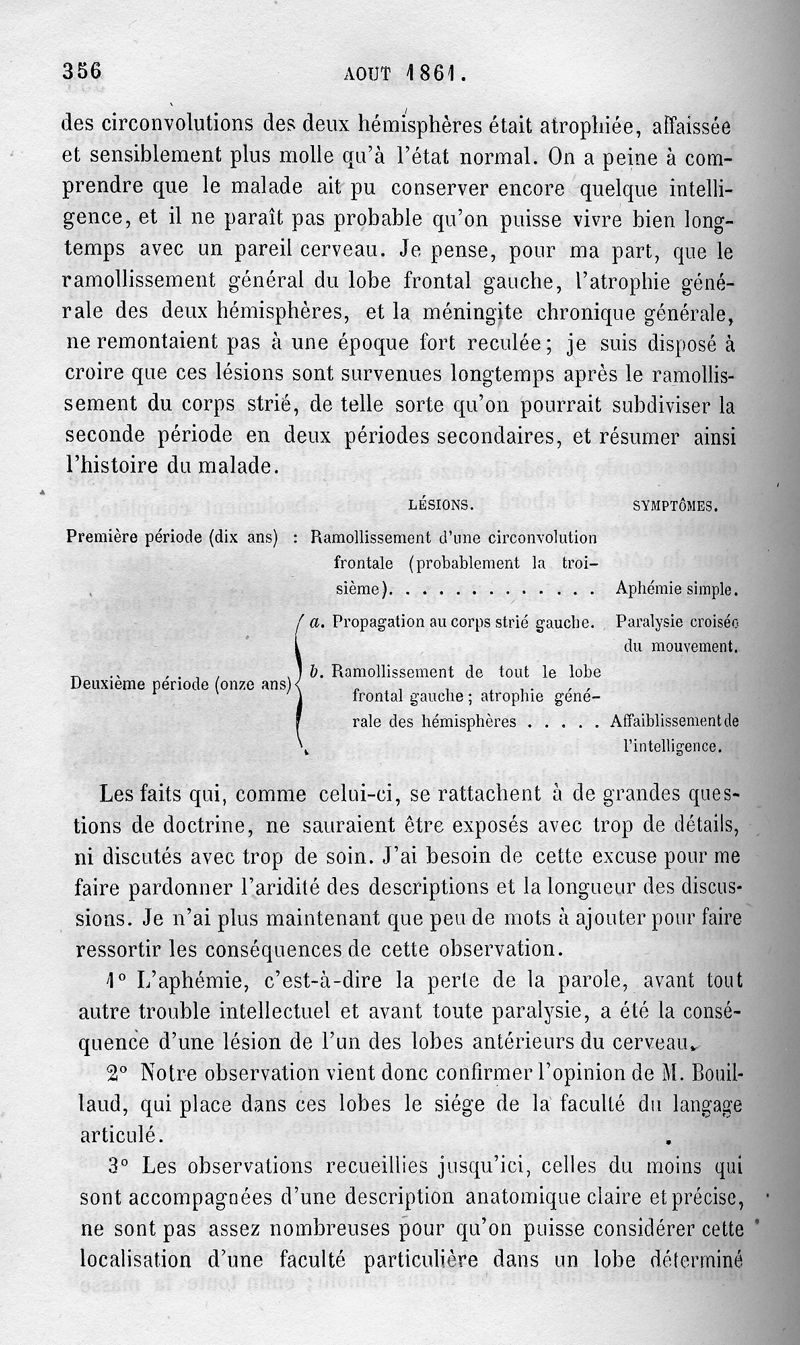 Remarques sur le siège de la faculté du langage articulé, suivie d'une observation d'aphémie (perte de la parole)