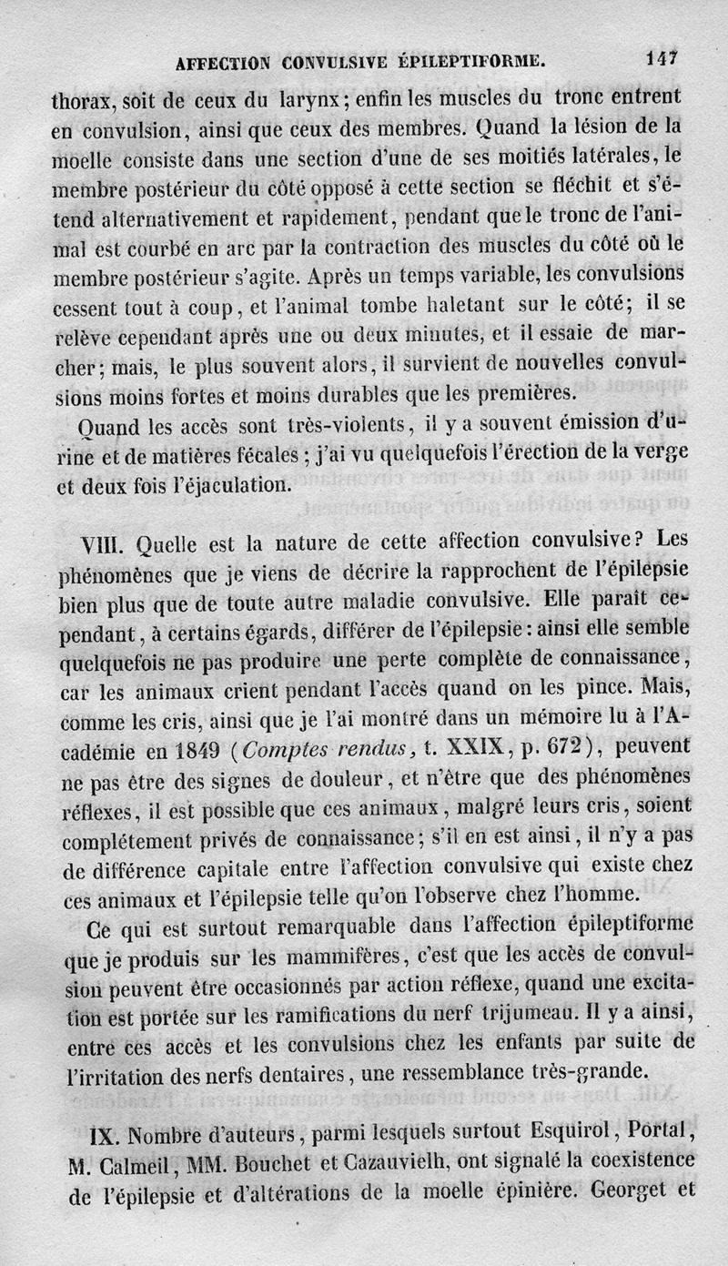 Recherches expérimentales sur la production d'une affection convulsive épileptiforme, à la suite de lésions de la moelle épinière