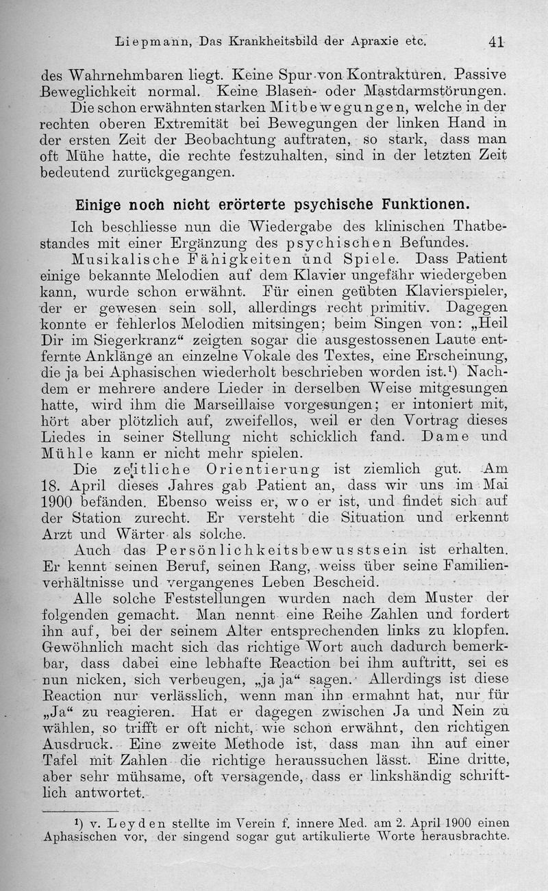 Das Krankheitsbild der Apaxie ("motorischen Asymbolie") auf Grund eines Falles von einseitiger Arpaxie