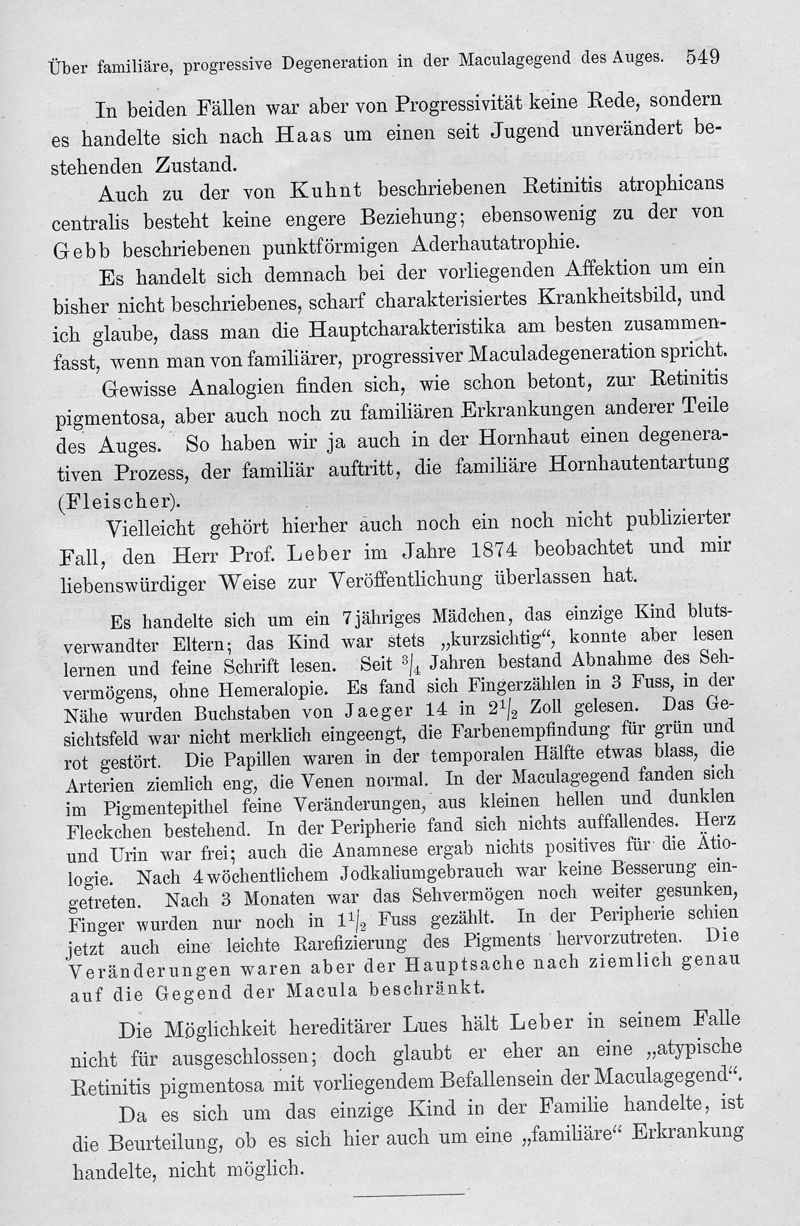 Über familiäre, progressive Degeneration in der Maculagegend des Auges