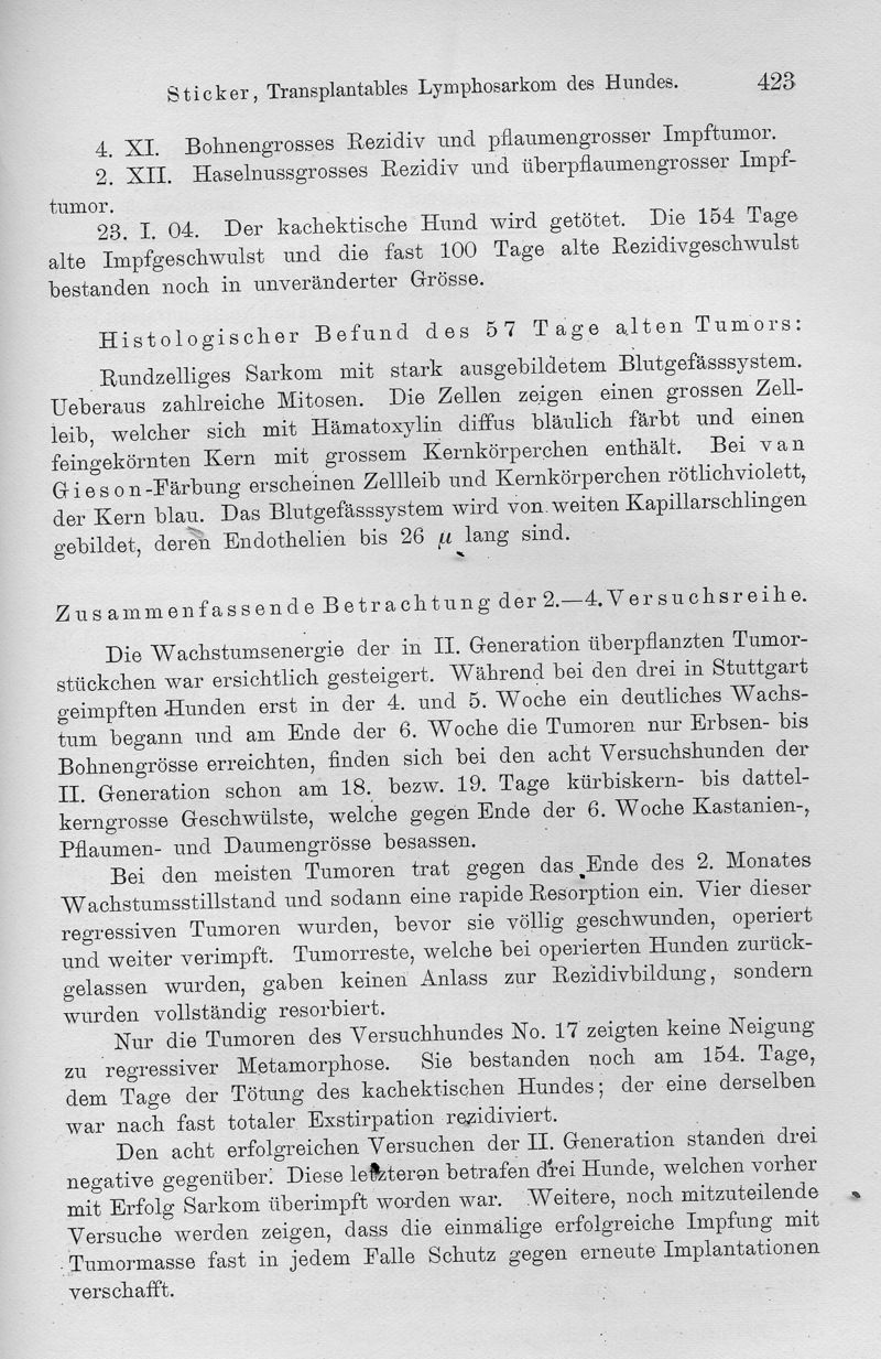 Transplantables Lymphosarkom des Hundes. Ein Beitrag zur Lehre der Krebsübertragbarkeit