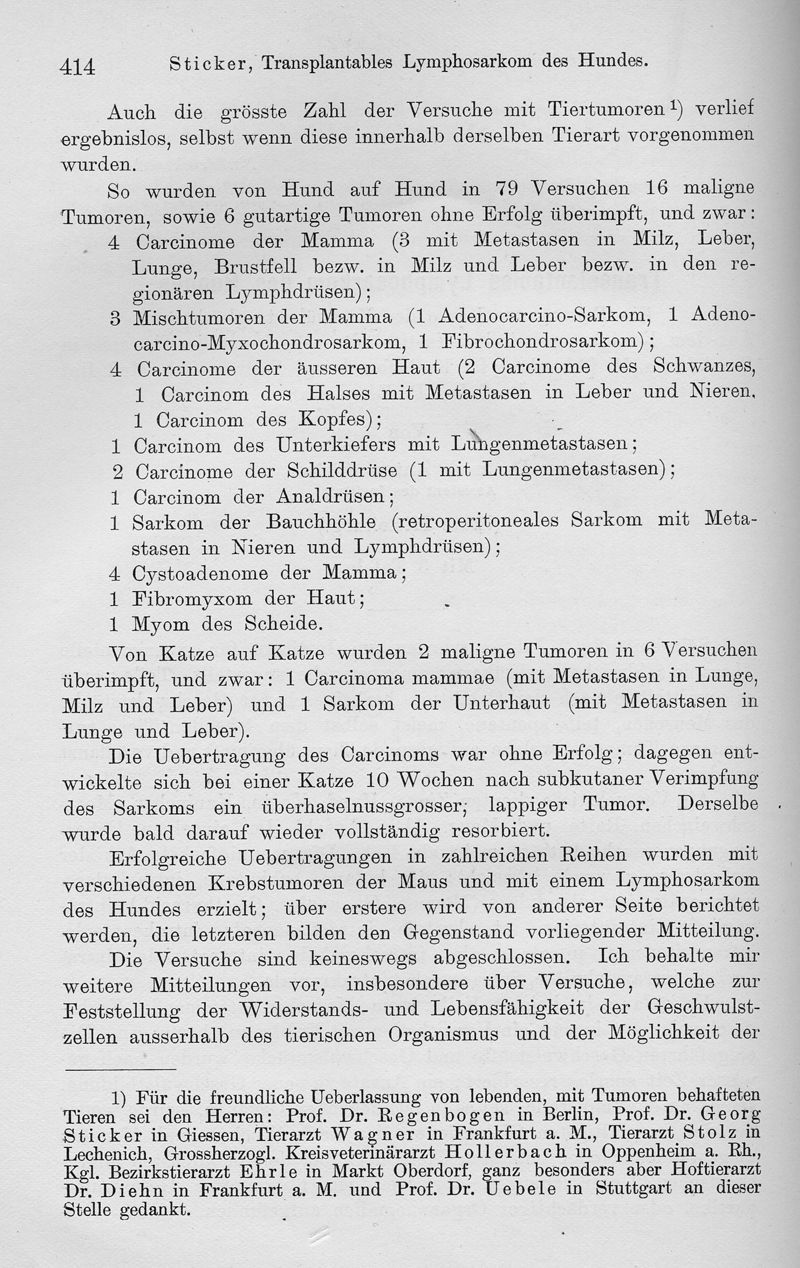 Transplantables Lymphosarkom des Hundes. Ein Beitrag zur Lehre der Krebsübertragbarkeit