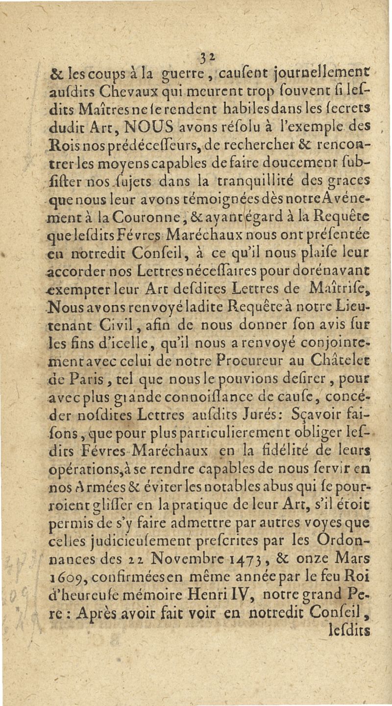 Statuts et ordonnances tant anciens que nouveaux des maistres févres-maréchaux de la ville, faubourgs et banlieue de Paris, confirmés par lettres patentes du mois d'octobre 1687, registrées au Parlement le 25 juin 1688