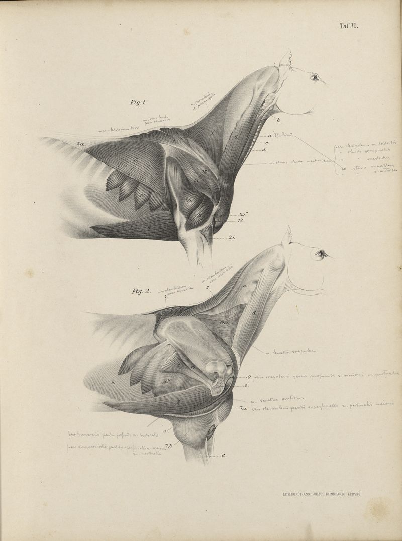 Atlas der Anatomie des Pferdes und der übrigen Hausthiere für Thierärzte und Studierende der Veterinärkunde, Landwirthschaftliche Lehranstalten und Pferdeliebhaber überhaupt. Mit erläuterndem Texte.I - Tafeln
