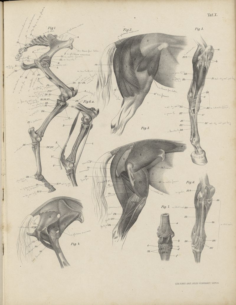 Atlas der Anatomie des Pferdes und der übrigen Hausthiere für Thierärzte und Studierende der Veterinärkunde, Landwirthschaftliche Lehranstalten und Pferdeliebhaber überhaupt. Mit erläuterndem Texte.I - Tafeln