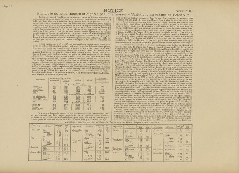 Vingt années d'expériences sur l'alimentation du cheval de trait : études sur les rations d'entretien, de marche et de travail. Composition des fourrages, digestibilié, statiques de l'eau et de l'azote