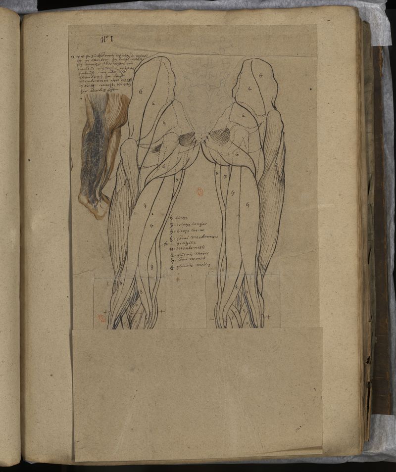 [Myologie de l'homme : tronc, membre supérieur, membre inférieur et corps entier ; précédée de deux feuillets non identifiés (nomenclature et schéma de viscères)]