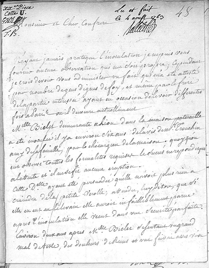 Ce recueil a été formé le 26 février 1768 par G.-J. de l'Épine, l'un des "commissaires de la Faculté sur le fait de l'inoculation.",