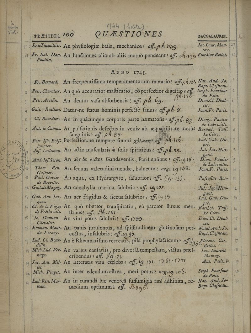 Quaestionum medicarum, quae circa medicinae theoriam et praxim, ante duo saecula, in Scholis Facultatis Medicinae Parisiensis, agitatae sunt & discussae, series chronologica ; cum doctorum praesidium, et baccalaureorum propugnantium nominibus