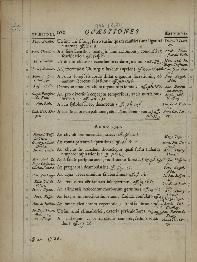 Quaestionum medicarum, quae circa medicinae theoriam et praxim, ante duo saecula, in Scholis Facultatis Medicinae Parisiensis, agitatae sunt & discussae, series chronologica ; cum doctorum praesidium, et baccalaureorum propugnantium nominibus