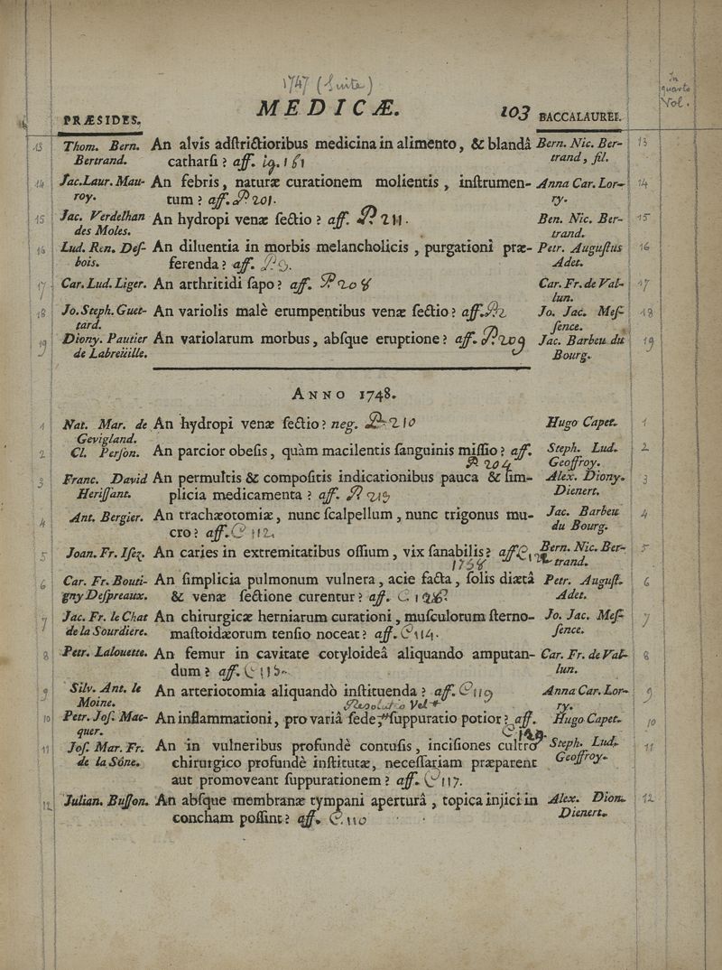 Quaestionum medicarum, quae circa medicinae theoriam et praxim, ante duo saecula, in Scholis Facultatis Medicinae Parisiensis, agitatae sunt & discussae, series chronologica ; cum doctorum praesidium, et baccalaureorum propugnantium nominibus