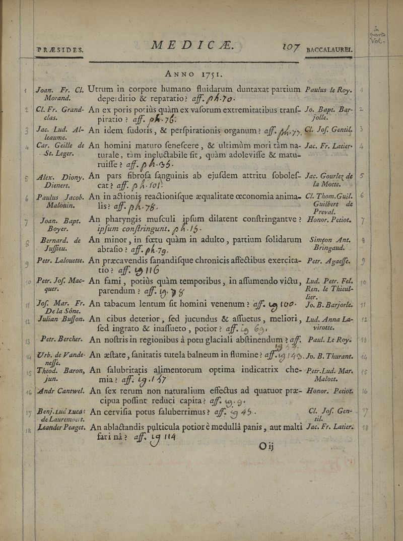 Quaestionum medicarum, quae circa medicinae theoriam et praxim, ante duo saecula, in Scholis Facultatis Medicinae Parisiensis, agitatae sunt & discussae, series chronologica ; cum doctorum praesidium, et baccalaureorum propugnantium nominibus