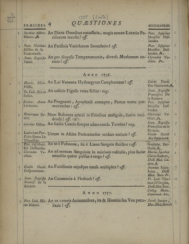 Quaestionum medicarum, quae circa medicinae theoriam et praxim, ante duo saecula, in Scholis Facultatis Medicinae Parisiensis, agitatae sunt & discussae, series chronologica ; cum doctorum praesidium, et baccalaureorum propugnantium nominibus