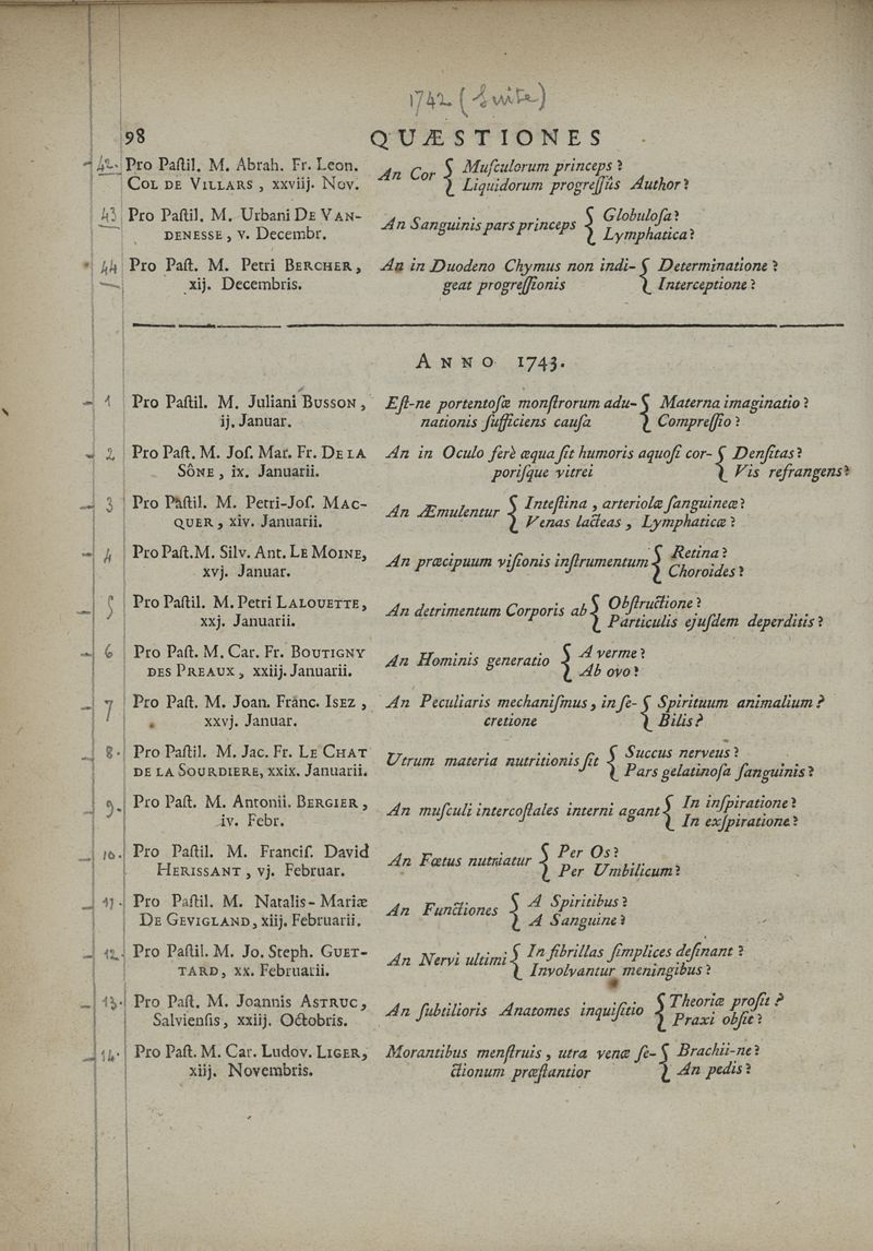 Quaestionum medicarum, quae circa medicinae theoriam et praxim, ante duo saecula, in Scholis Facultatis Medicinae Parisiensis, agitatae sunt & discussae, series chronologica ; cum doctorum praesidium, et baccalaureorum propugnantium nominibus