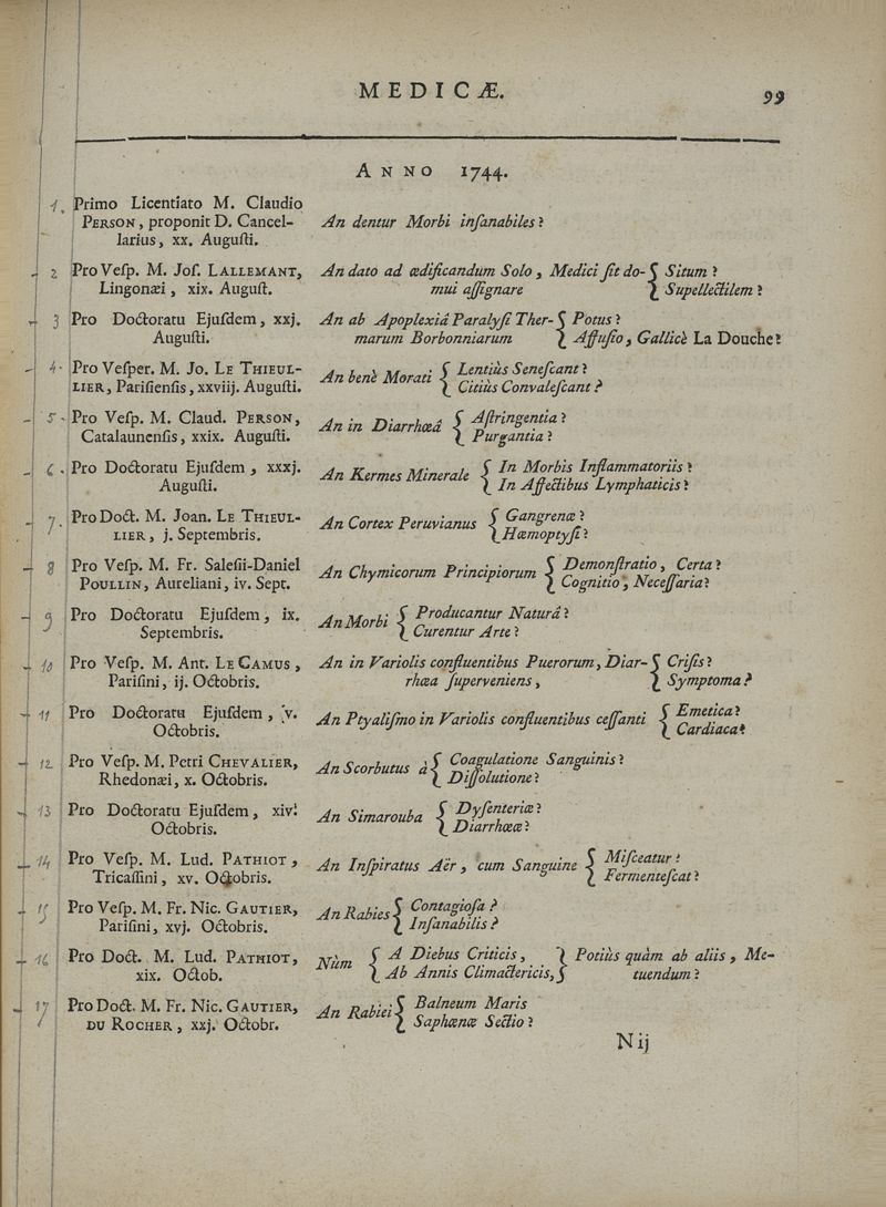 Quaestionum medicarum, quae circa medicinae theoriam et praxim, ante duo saecula, in Scholis Facultatis Medicinae Parisiensis, agitatae sunt & discussae, series chronologica ; cum doctorum praesidium, et baccalaureorum propugnantium nominibus