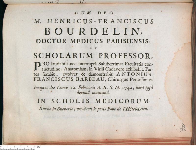 M. Henricus-Franciscus Bourdelin […] Anatomiam, in Virili Cadavere exhibebit. Partes secabit, evolvet & demonstrabit Antonius-Franciscus Barbeau