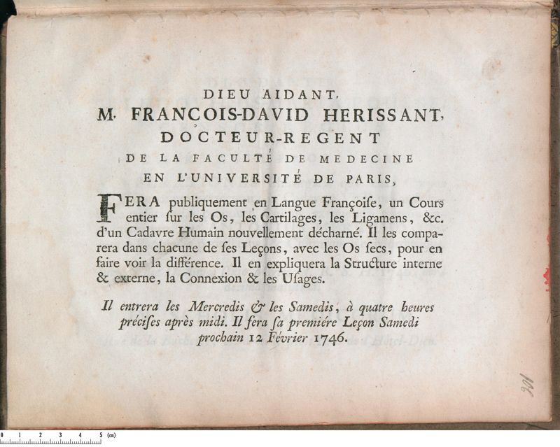 M. François-David Herissant […] Fera publiquement en Langue Françoise, un Cours entier sur les Os, les Cartilages, les Ligamens, &c. d'un Cadavre Humain nouvellement décharné. Il les comparera dans chacune de ses leçons, avec les Os secs, pour en faire voir la différence. Il en expliquera la Structure interne & externe, la Connexion & les Usages.