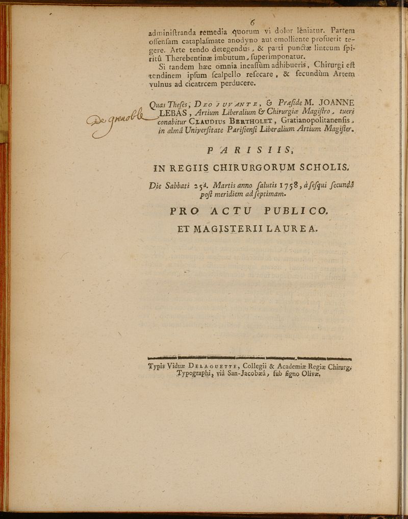 Paris : Typis Viduae Delaguette, Collegii & Academiae Regiae Chirurgorum Typographi, viâ San-Jacobaeâ, sub signo Olivae
