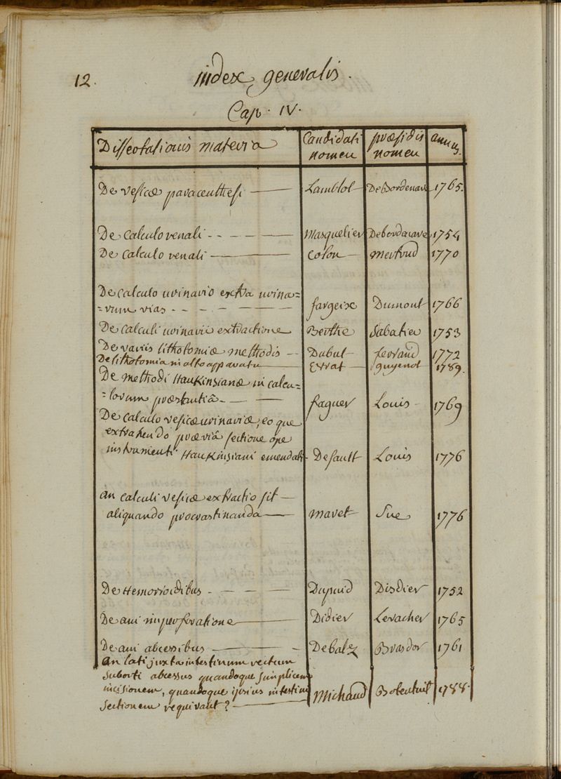 Positionum quae circa anatomiam et chirurgiae praxim. Ab anno 1749, ad finem anni 1786[, 87, 88, 89, 90,] in Scholis collegii chirurgiae parisiensis, agitatae sunt et discussae, series chronologica, cum magistrorum praesidum & candidatorum propugnantium nominibus [suivi de] Index generalis dissertationum quae in Regiis chirurgicorum Scholis habitae fuerunt, ab anno 1749 ad annum [1786 et 1789]