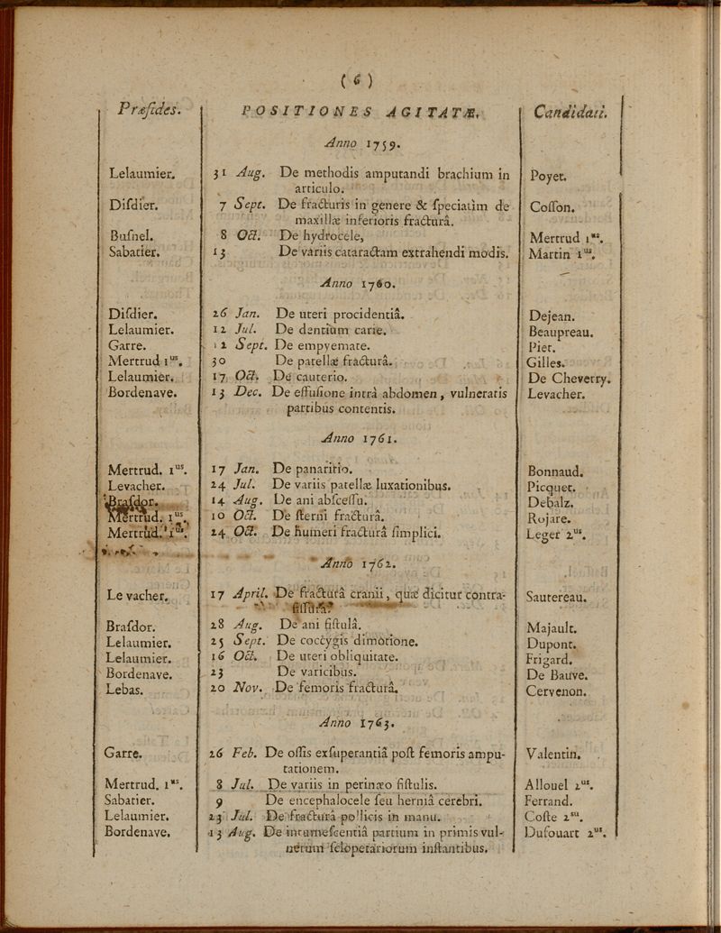 Positionum quae circa anatomiam et chirurgiae praxim. Ab anno 1749, ad finem anni 1786[, 87, 88, 89, 90,] in Scholis collegii chirurgiae parisiensis, agitatae sunt et discussae, series chronologica, cum magistrorum praesidum & candidatorum propugnantium nominibus [suivi de] Index generalis dissertationum quae in Regiis chirurgicorum Scholis habitae fuerunt, ab anno 1749 ad annum [1786 et 1789]
