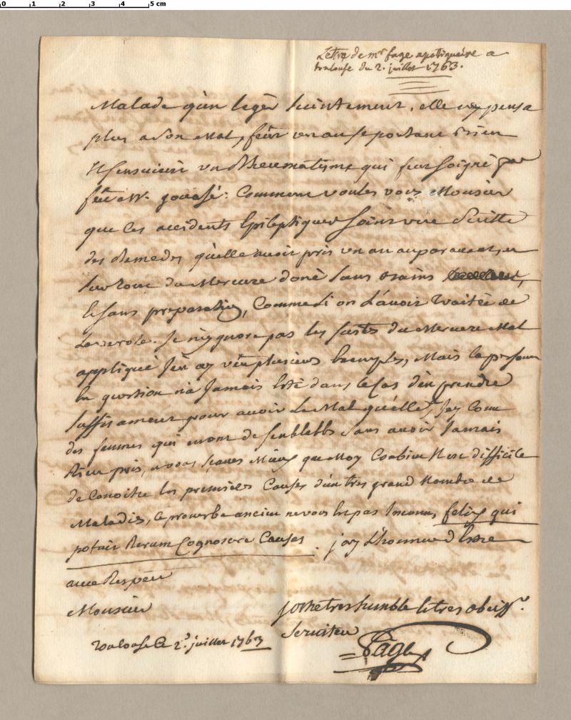 [Lettres médicales du XVIIIè s. - Lettres de Albaret, Bonnefoy, Dufort, Goulard chirurgien, Maurillon, Mullard, Pagès, Piegon, Pons au Dr Haguenot de Montpellier (1737-1769). Consultations médicales. ]