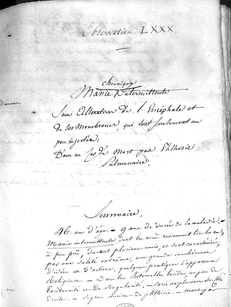 Histoire clinique de la folie, d'après les observations recueillies pendant dix ans dans la division des aliénés de l'hospice de Bicêtre, et pendant sept ans dans celle de l'Hospice de la Salpétrière