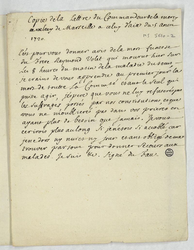 F.B. du Fau, commandeur du Couvent de la Mercy. Deux certificats de décès établis pendant la peste de Marseille en août 1720 et lettre au commandeur de la Mercy d'Aix