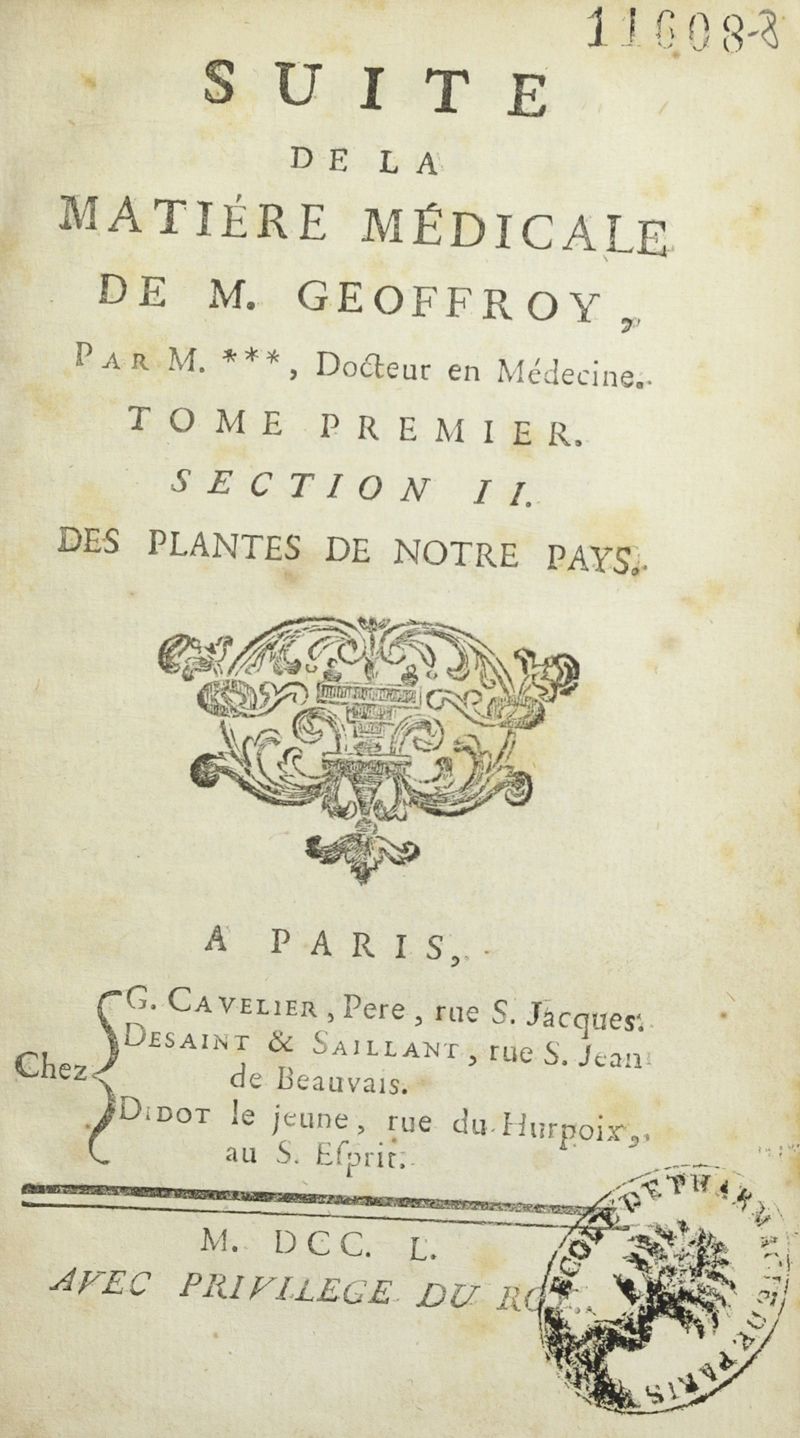 A Paris, chez G. Cavelier, pere, rue S. Jacques. Desaint & Saillant, rue S. Jean de Beauvais. Didot le jeune, rue du Hurpoix, au S. Esprit. M. DCC. L. Avec privilege du Roy.,
