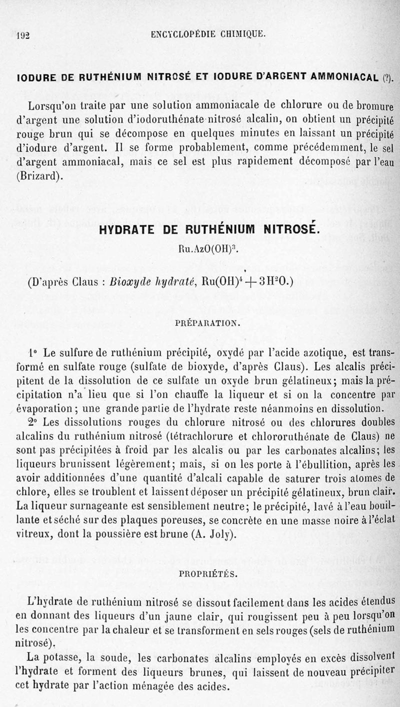 Encyclopédie chimique.Tome III.- Métaux. 17e cahier : platine et métaux qui l'accompagnent, 1er fascicule osmium et ruthénbium, par MM. A. Jolyn.
