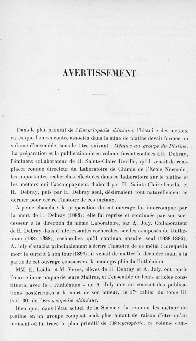 Encyclopédie chimique.Tome III.- Métaux. 17e cahier : platine et métaux qui l'accompagnent, 1er fascicule osmium et ruthénbium, par MM. A. Jolyn.