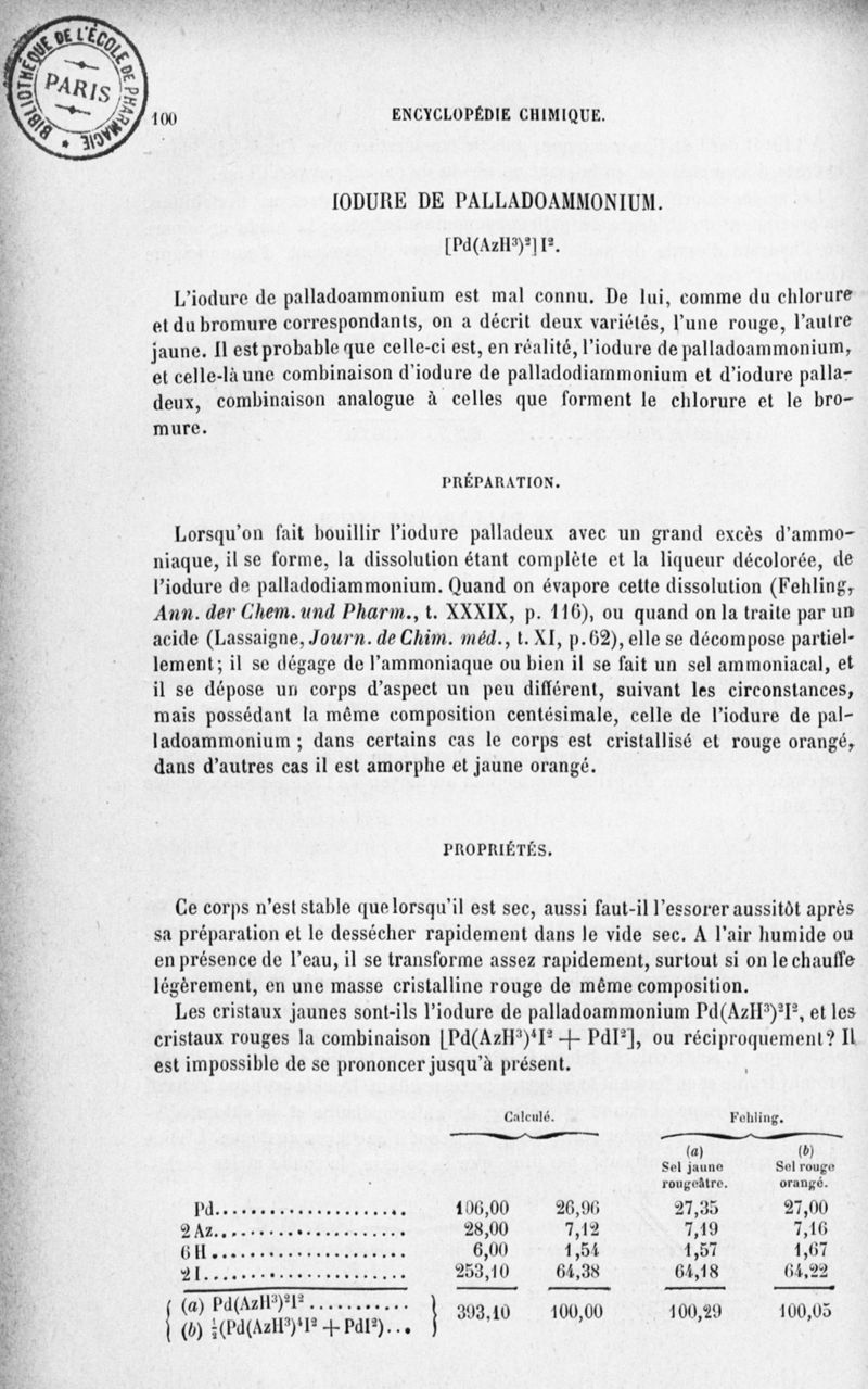 Encyclopédie chimique.Tome III.- Métaux. 17e cahier : platine et métaux qui l'accompagnent, 3e fascicule palladium, iridium et rhodium, par M. E. Leidié.
