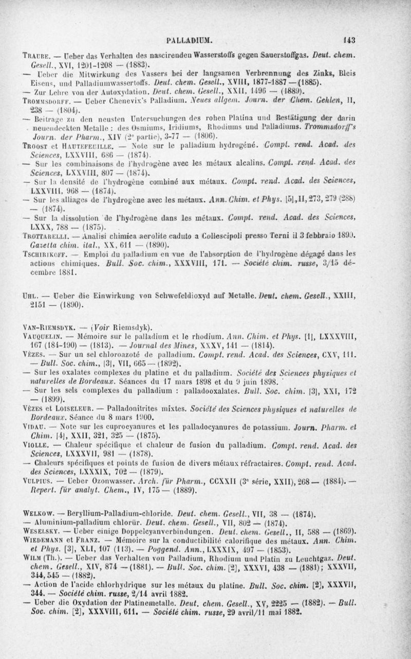 Encyclopédie chimique.Tome III.- Métaux. 17e cahier : platine et métaux qui l'accompagnent, 3e fascicule palladium, iridium et rhodium, par M. E. Leidié.