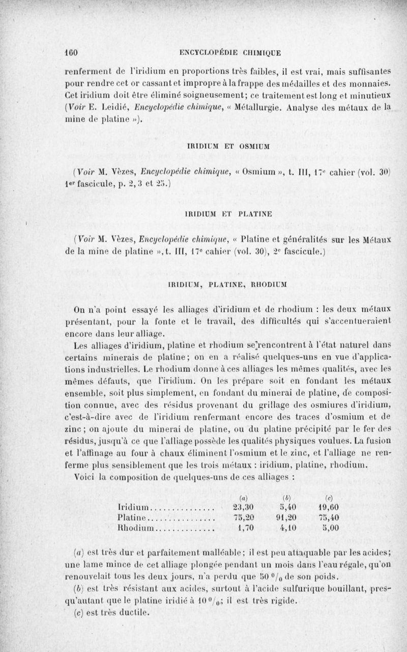Encyclopédie chimique.Tome III.- Métaux. 17e cahier : platine et métaux qui l'accompagnent, 3e fascicule palladium, iridium et rhodium, par M. E. Leidié.