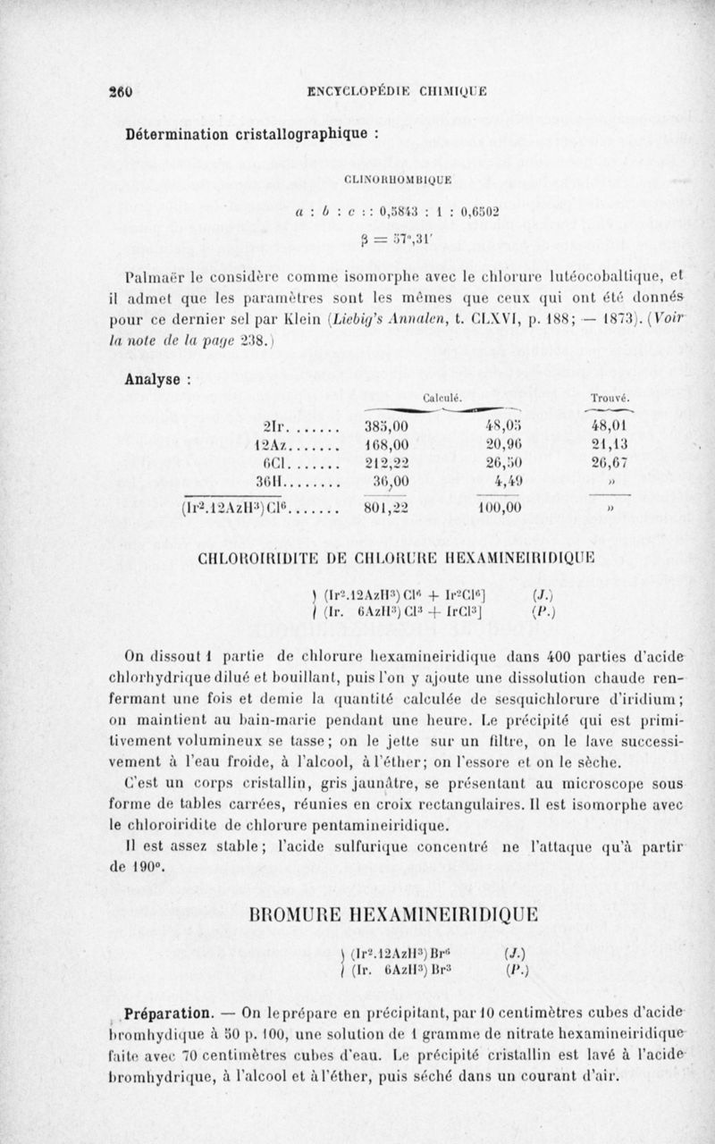 Encyclopédie chimique.Tome III.- Métaux. 17e cahier : platine et métaux qui l'accompagnent, 3e fascicule palladium, iridium et rhodium, par M. E. Leidié.