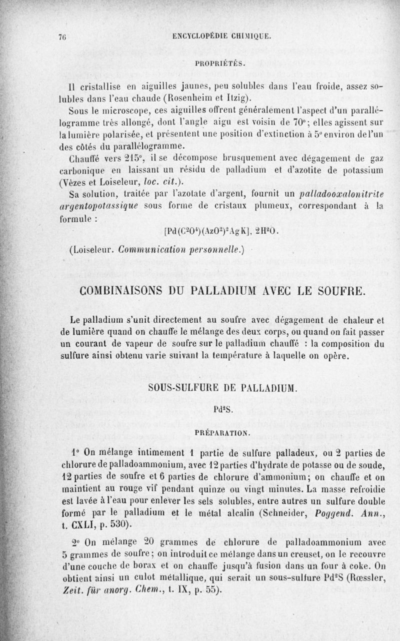 Encyclopédie chimique.Tome III.- Métaux. 17e cahier : platine et métaux qui l'accompagnent, 3e fascicule palladium, iridium et rhodium, par M. E. Leidié.