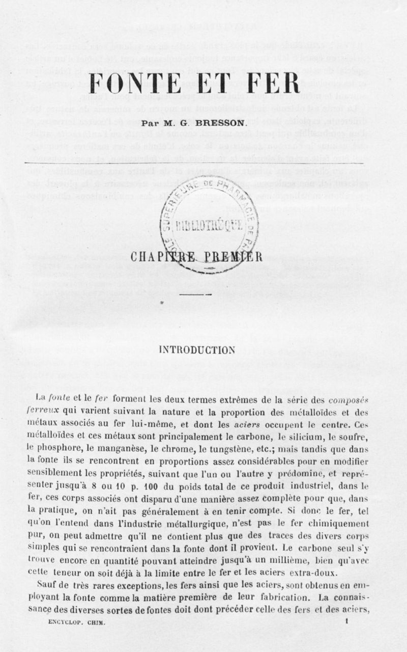 Encyclopédie chimique.Tome V.- Applications de la chimie inorganique. 2eme section : industries chimiques. 2e partie : métallurgie. Fonte et fer, par M. G. Bresson.
