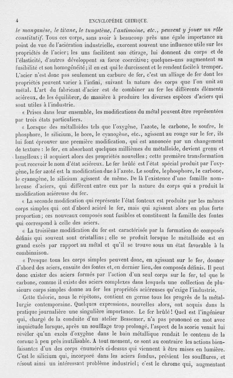 Encyclopédie chimique.Tome V.- Applications de la chimie inorganique. 2eme section : industries chimiques. 2e partie : métallurgie. Aciers, par M. G. Bresson.