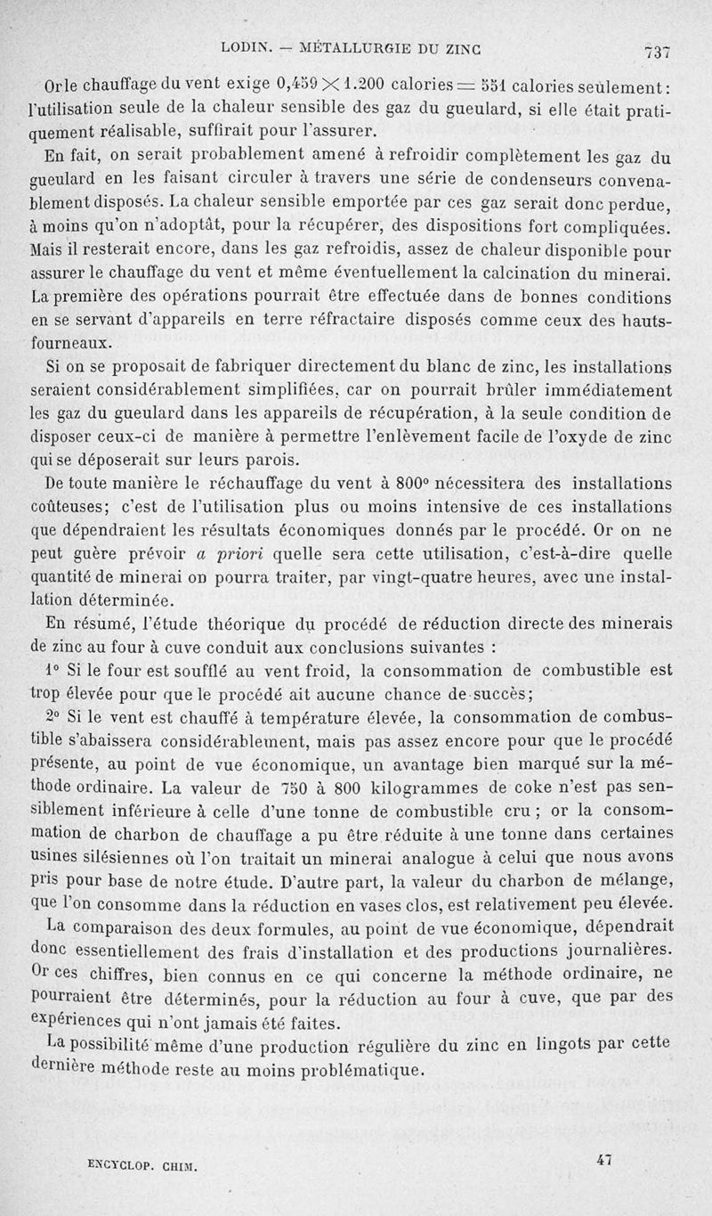 Encyclopédie chimique.Tome V.- Applications de la chimie inorganique. 2eme section : industries chimiques. 2e partie : métallurgie. Métallurgie du zinc, par M. A. Lodin.