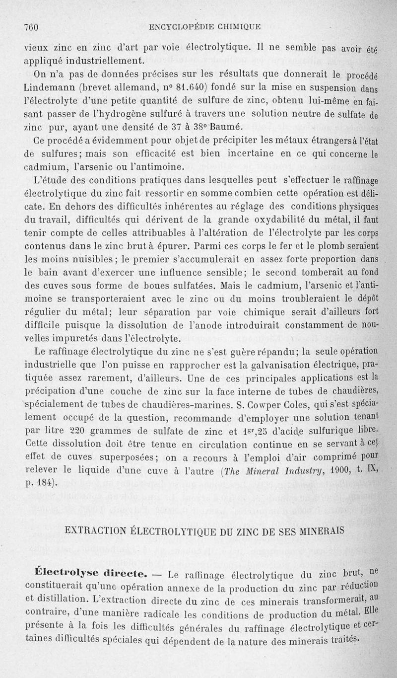 Encyclopédie chimique.Tome V.- Applications de la chimie inorganique. 2eme section : industries chimiques. 2e partie : métallurgie. Métallurgie du zinc, par M. A. Lodin.