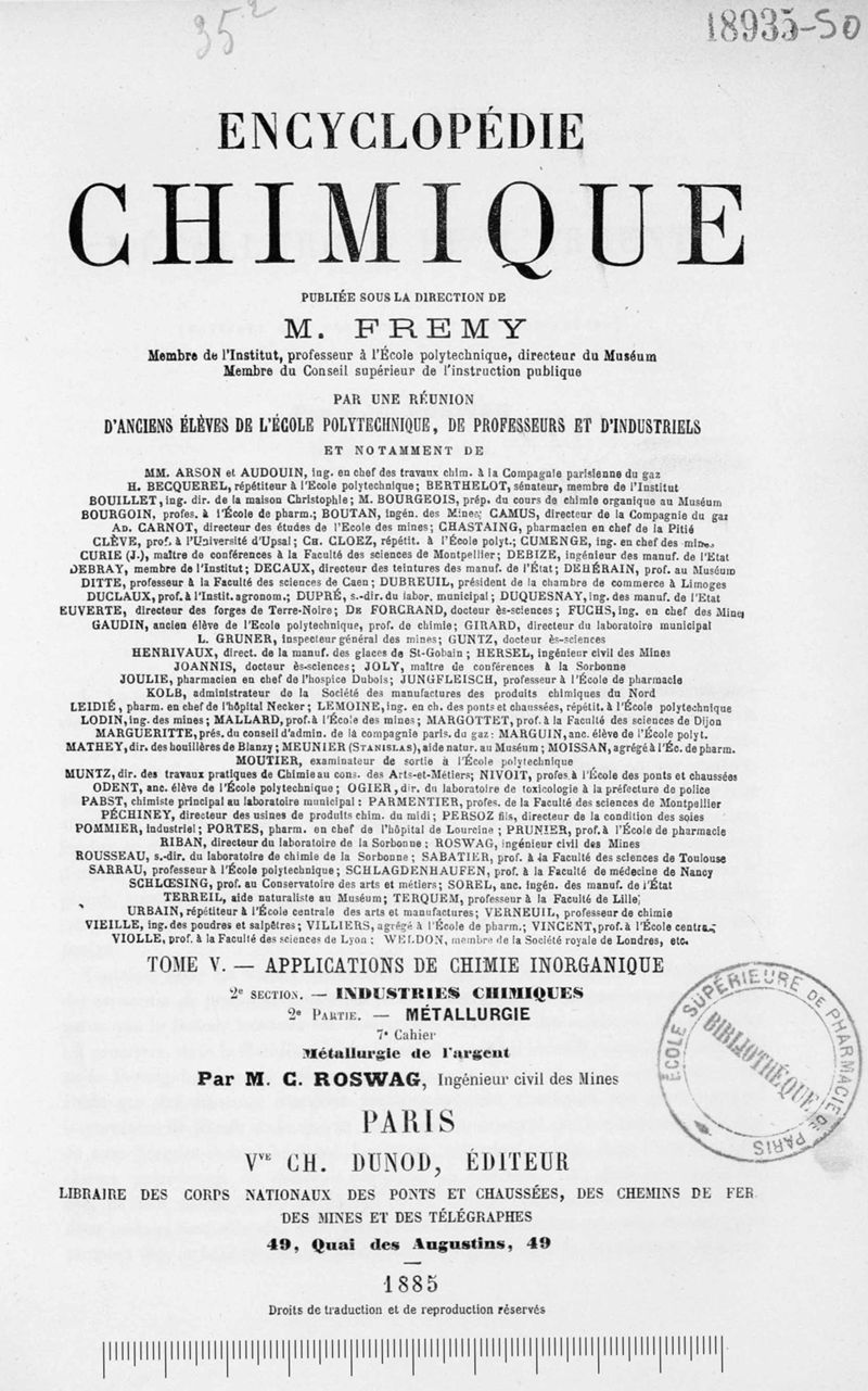 Encyclopédie chimique.Tome V.- Applications de la chimie inorganique. 2eme section : industries chimiques. 2e partie : métallurgie. Métallurgie de l'argent, par M. C. Roswag.