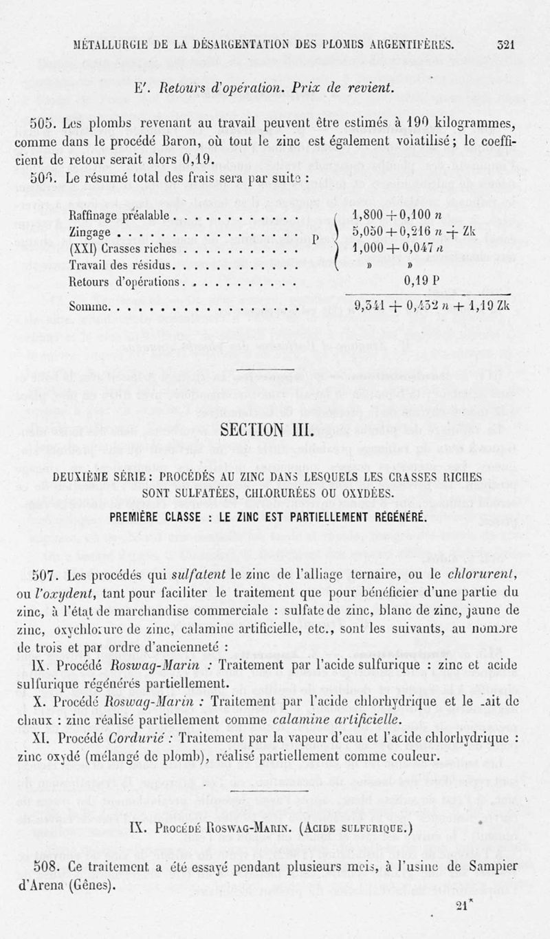 Encyclopédie chimique.Tome V.- Applications de la chimie inorganique. 2eme section : industries chimiques. 2e partie : métallurgie. Désargentation des minerais de plomb, par M. C. Roswag.