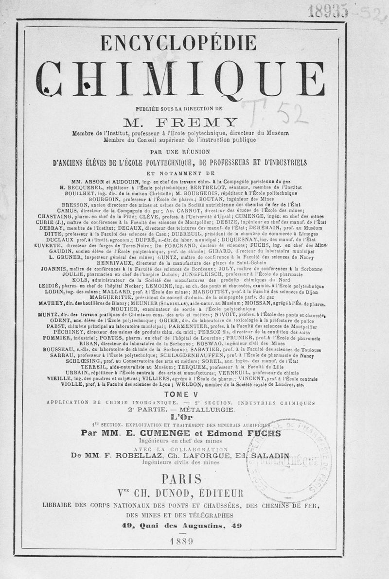 Encyclopédie chimique.Tome V.- Applications de la chimie inorganique. 2eme section : industries chimiques. 2e partie : métallurgie. L'or, par MM. E. Cumenge et Edmond Fuchs.