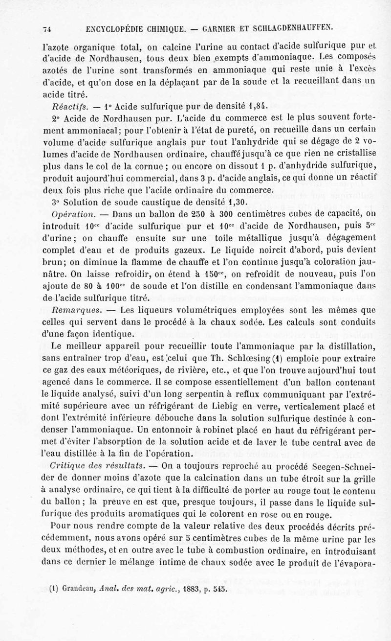 Encyclopédie chimique.Tome IX.- Applications de chimie organique. 2e section : chimie physiologique. Analyse chimique des liquides et des tissus de l'organisme, par les Drs Garnier et Schlagdenhauffen.