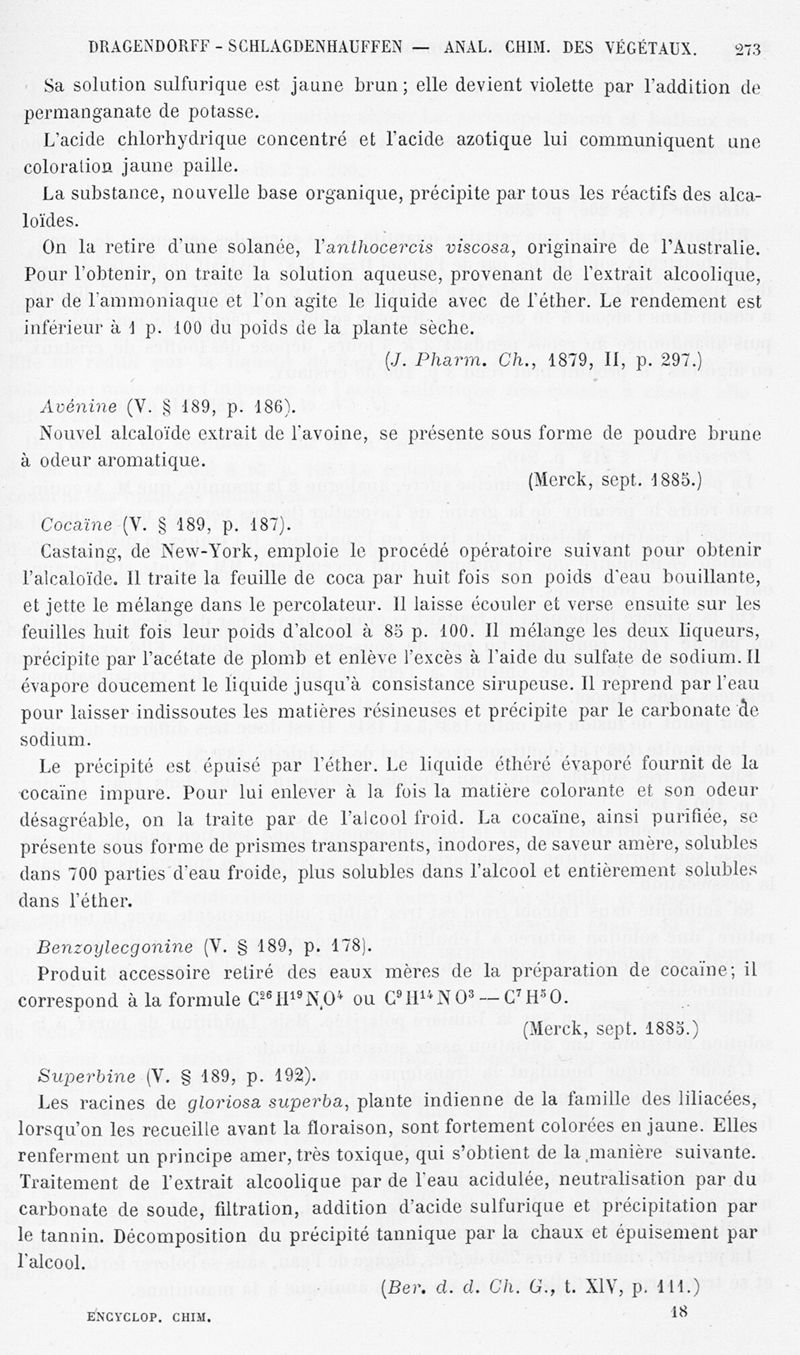 Encyclopédie chimique.Tome X.- Applications de chimie organique. Analyse chimique des végétaux, par MM. G. Dragendorff et F. Schlagdenheuffen.