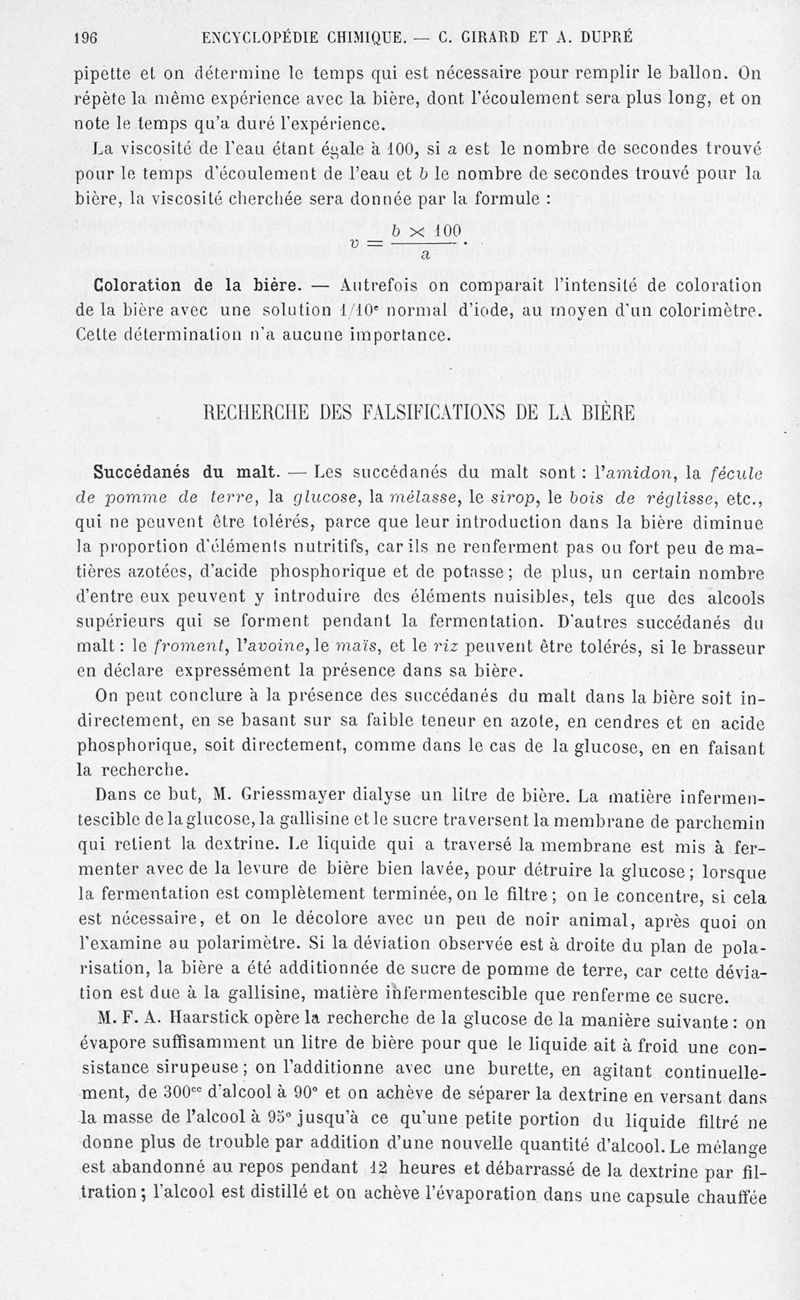 Encyclopédie chimique.Tome X.- Applications de chimie organique. Analyse des matières alimentaieres et recherche de leurs falsifications, par MM. Ch. Girard et A. Dupré.