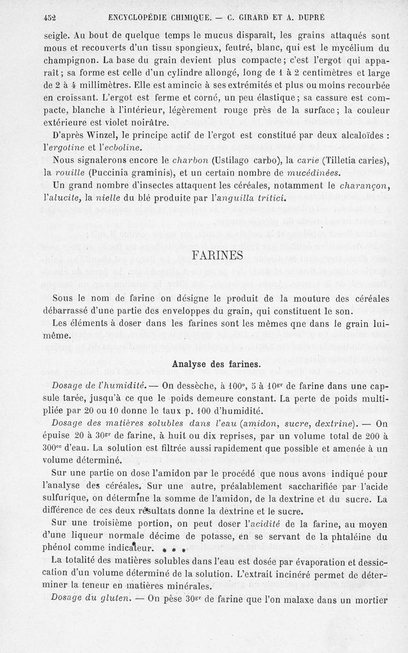 Encyclopédie chimique.Tome X.- Applications de chimie organique. Analyse des matières alimentaieres et recherche de leurs falsifications, par MM. Ch. Girard et A. Dupré.