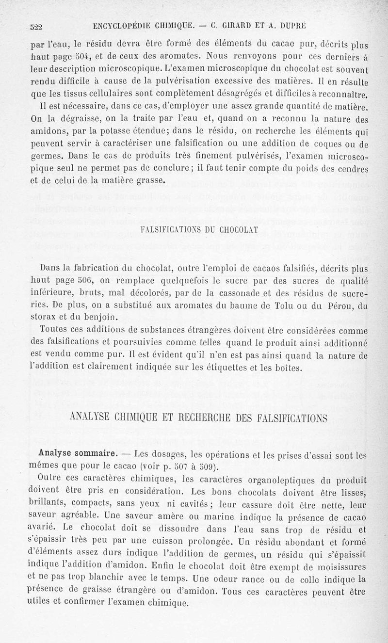 Encyclopédie chimique.Tome X.- Applications de chimie organique. Analyse des matières alimentaieres et recherche de leurs falsifications, par MM. Ch. Girard et A. Dupré.