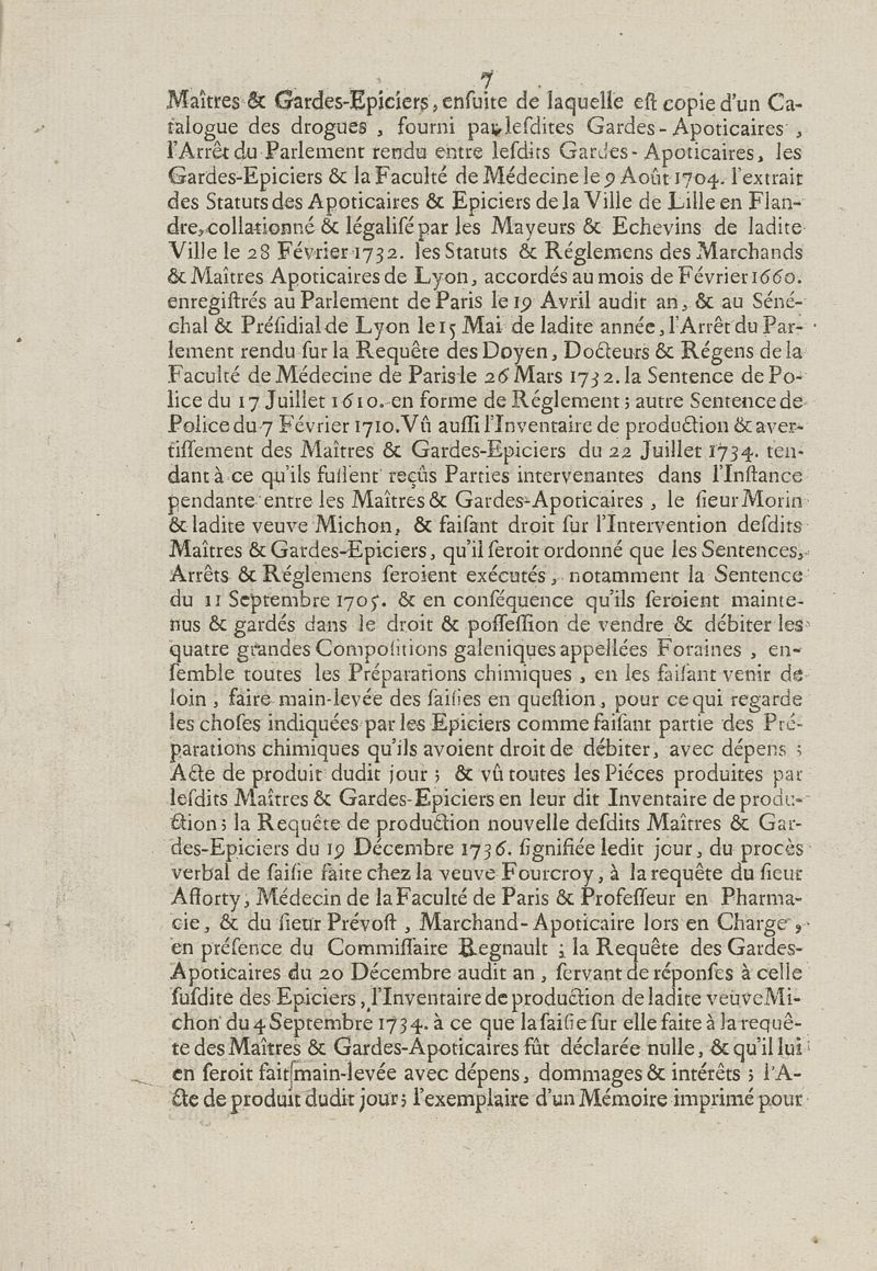 Sentence de règlement, rendue en faveur du corps des marchands apoticaires, contre plusieurs épiciers ; et contre les maîtres et gardes du corps des marchands épiciers... du 29 décembre 1736